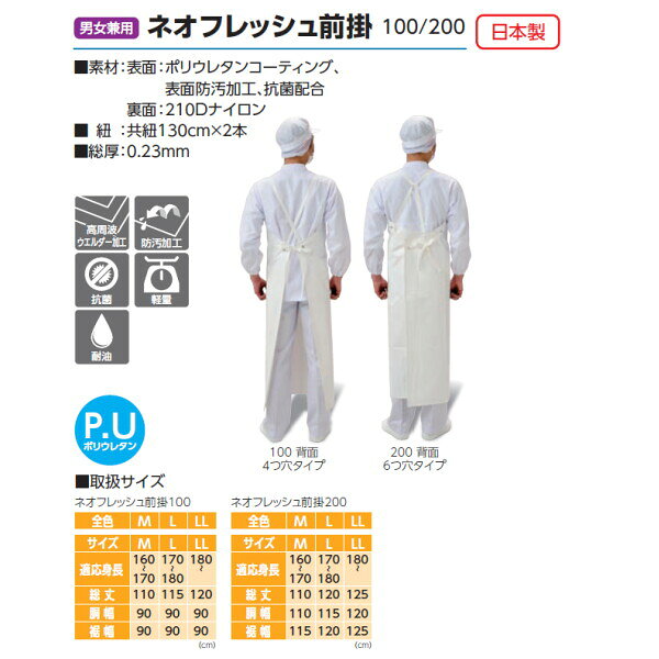 コメントよごれにくい男女兼用ネオフレッシュ前掛200/日本製■素材:表面:ポリウレタンコーティング、表面防汚加工、抗菌配合裏面:210Dナイロン■ 紐:共紐130cm×2本■総厚:0.23mm食品衛生法適合かるいよごれにくいつまりにくい油につよい環境に優しい耐油&防汚・防血性に優れていますサイズ(適応身長)/総丈/胴幅/裾幅M(160-170)/110/110/115L(170-180)/115/115/120LL(180〜)/120/120/125